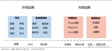 國內寵物食品市場分為內外資兩大陣營,中國寵物行業起步階段,以銷售外資品牌為主。目前國內品牌分為兩大類型,一種由生產商轉型創立, 如中寵旗下的 Wanpy頑皮、Zeal真致、Happy100,以及佩蒂股份旗下的好適嘉和齒能 等。另一類是2015年后受隨資本助推,催生的一系列電商產品諸如“瘋狂的小狗”、“超能小黑”、“乖寶”、“豆柴”等。新興品牌會先采取品牌商方式進行運營,在占據一定市場份額后獨立設立自己的生產工廠,這種方式能迅速擴大營收,但在產品品質和質量安全方面存在一定風險。