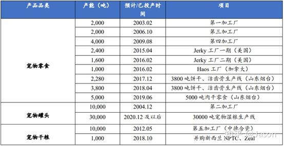 2020年營收(億元)產能情況產能布局地主營方向中寵股份12.33如下圖山東,加拿大,新西蘭、美國、柬埔寨寵物零食、罐頭、干糧、用品佩蒂股份13.39見下圖浙江、江蘇、上海、北京、越南、柬埔寨、新西蘭主糧和濕糧,咬膠、營養肉質零食路斯股份4.252個現代化工廠、7個GMP標準加工車間,年產能3萬余噸山東、甘肅肉干產品、罐頭、餅干、潔牙骨飼料圖表 36. 2020年中寵股份產能情況